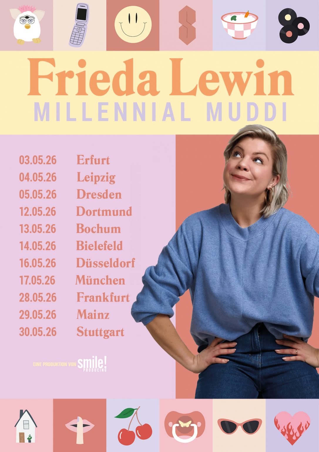 Mit dem eigenen Comedy-Programm auf der Bühne – und das in ganz Deutschland. Frieda kriegt bei dem Gedanken zwar immer noch ein paar Angst-Pupser, aber Bock hat sie dennoch. Ihr auch? Dann sichert euch jetzt Tickets für Friedas Comedy Show „MILLENNIAL MUDDI“.